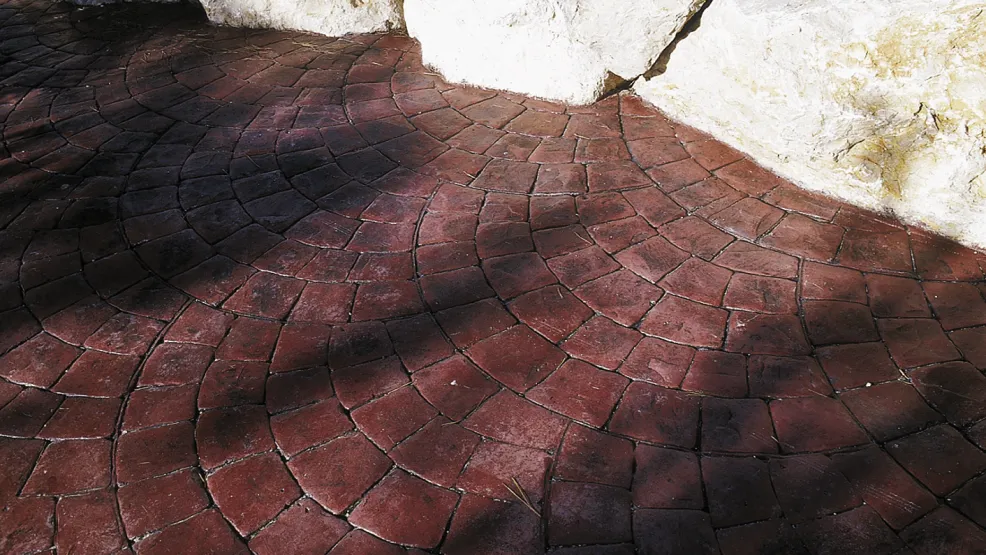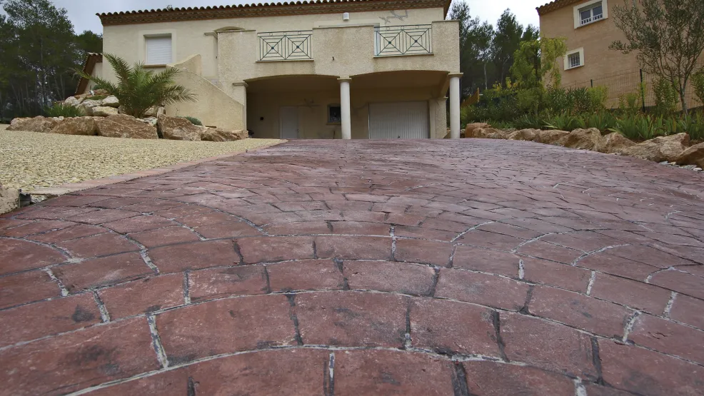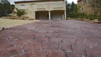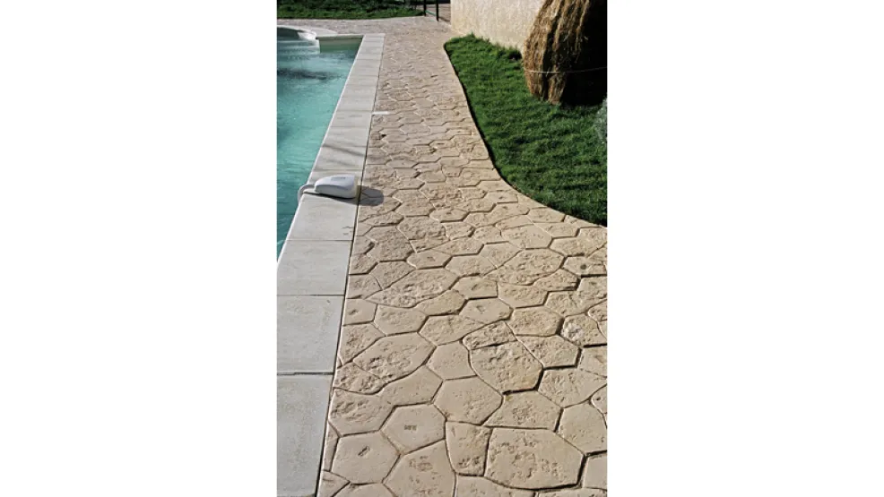 Béton décoratif matricé, coloré dans la masse et imprimé, reproduisant l’aspect et l’esthétisme de différents matériaux : dalles, pavés, bois