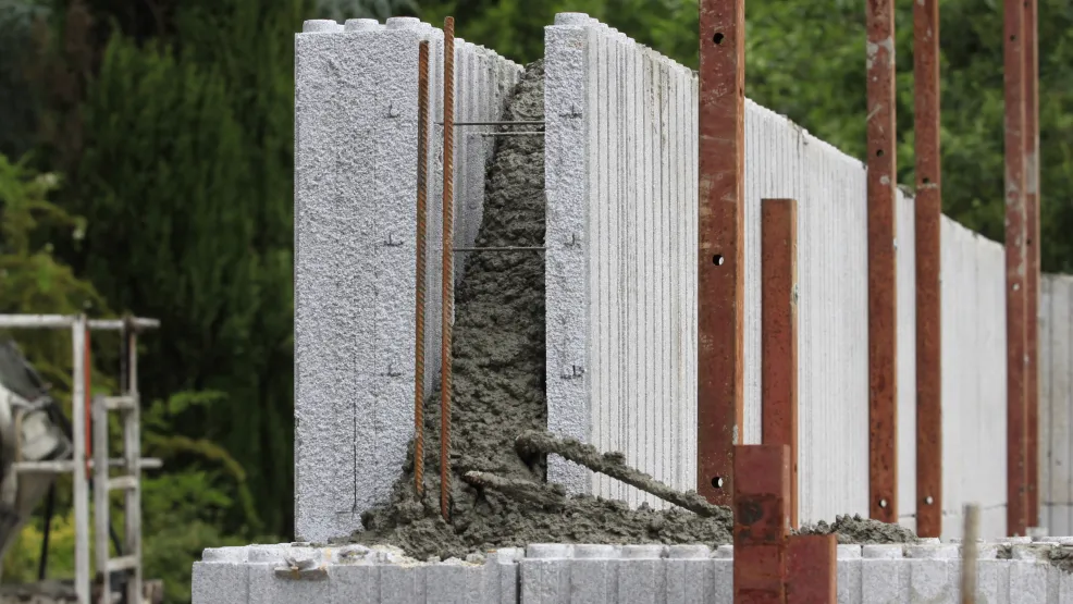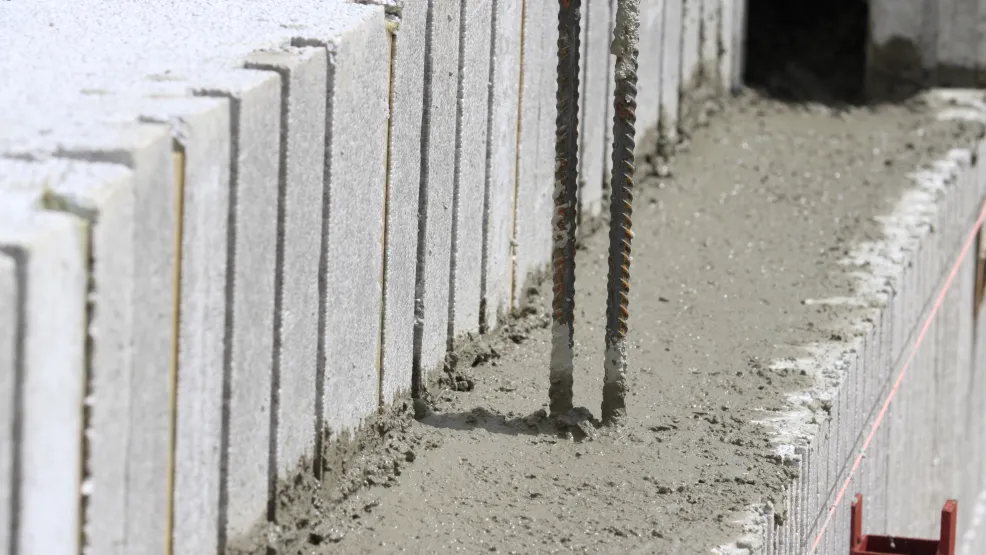 EUROMAC 2 produit des blocs en polystyrène expansé de haute densité associés entre eux par un entrevous en acier. Ces blocs sont empilés les uns sur les autres ; un voile de béton est coulé au centre.